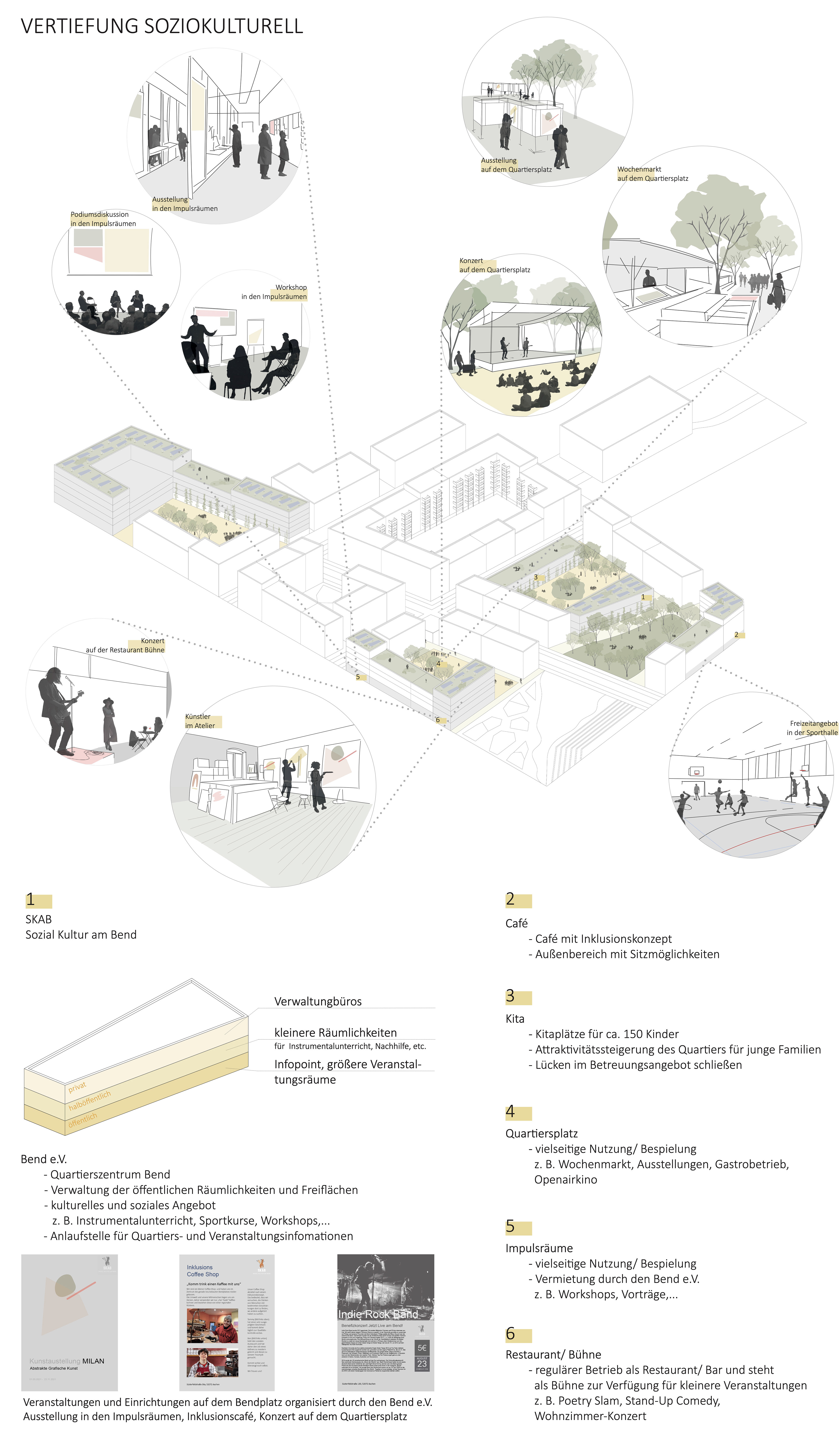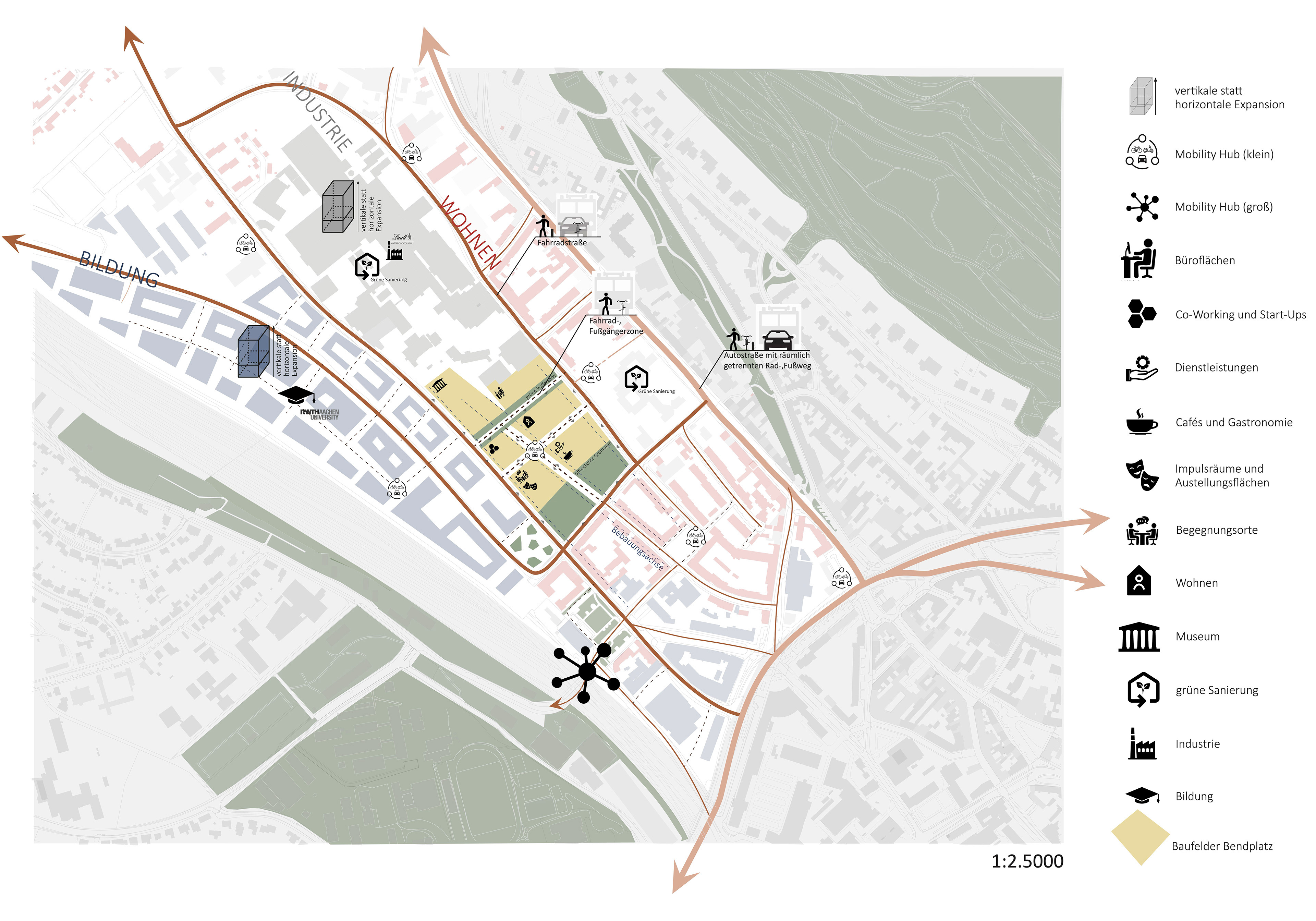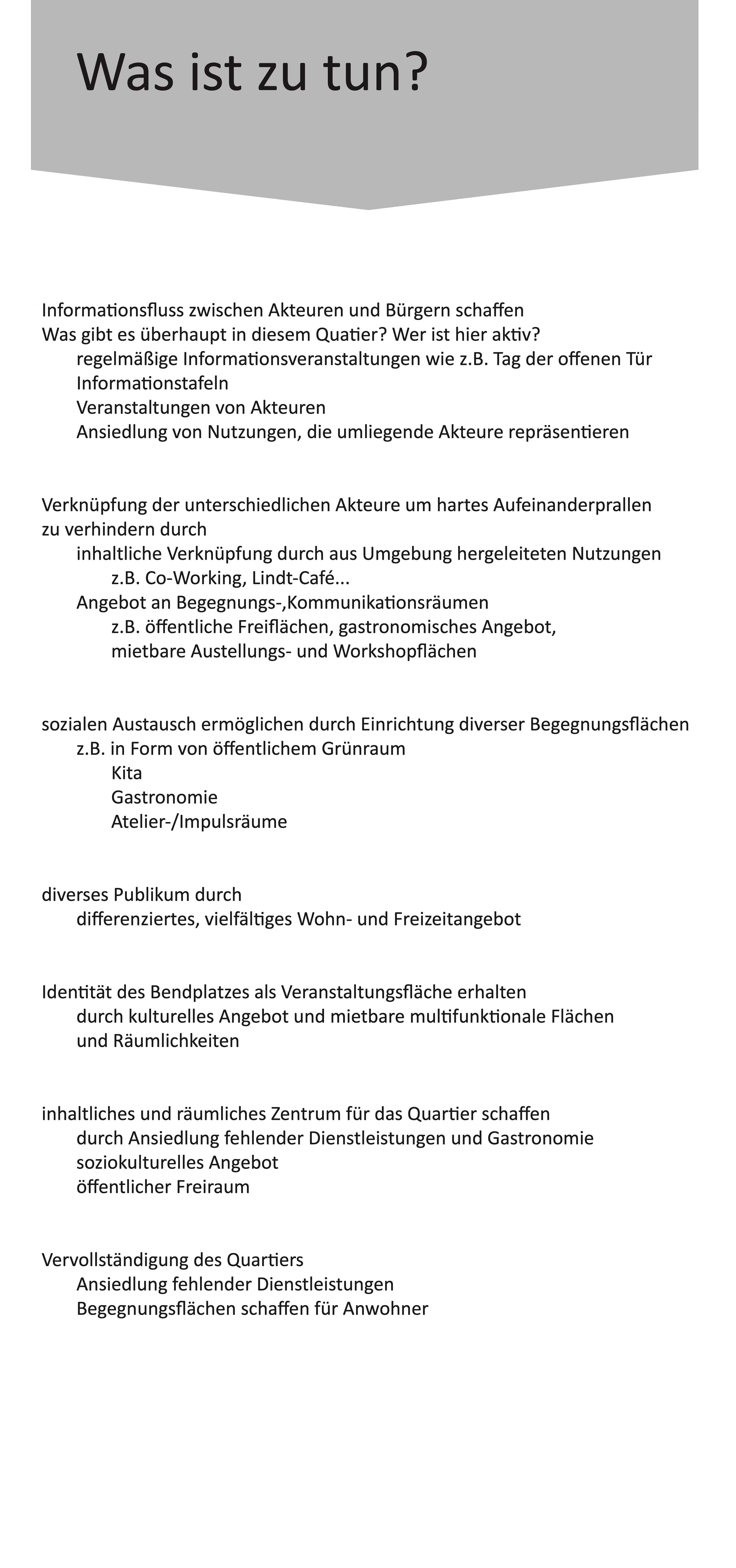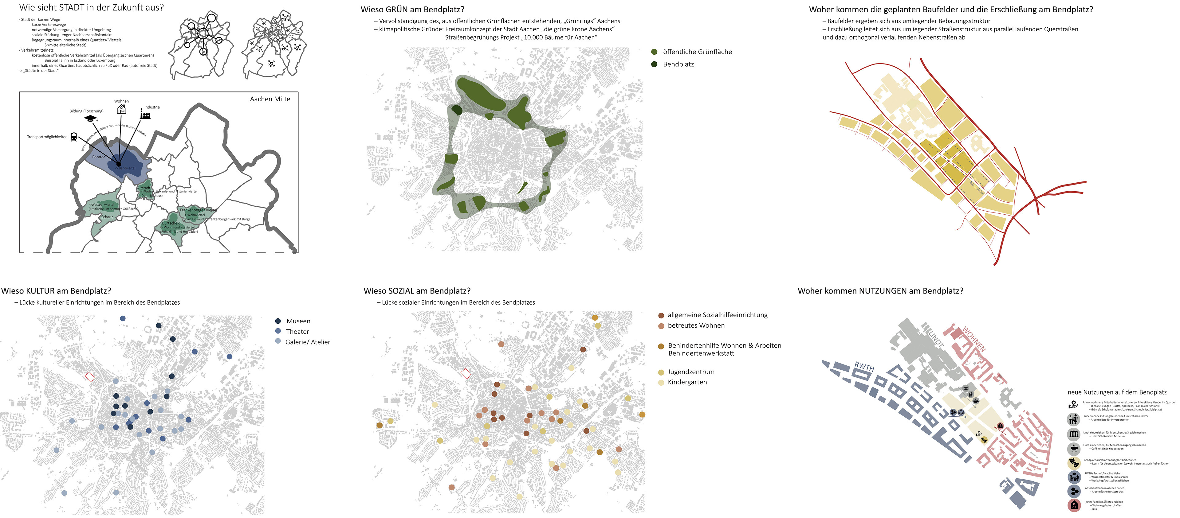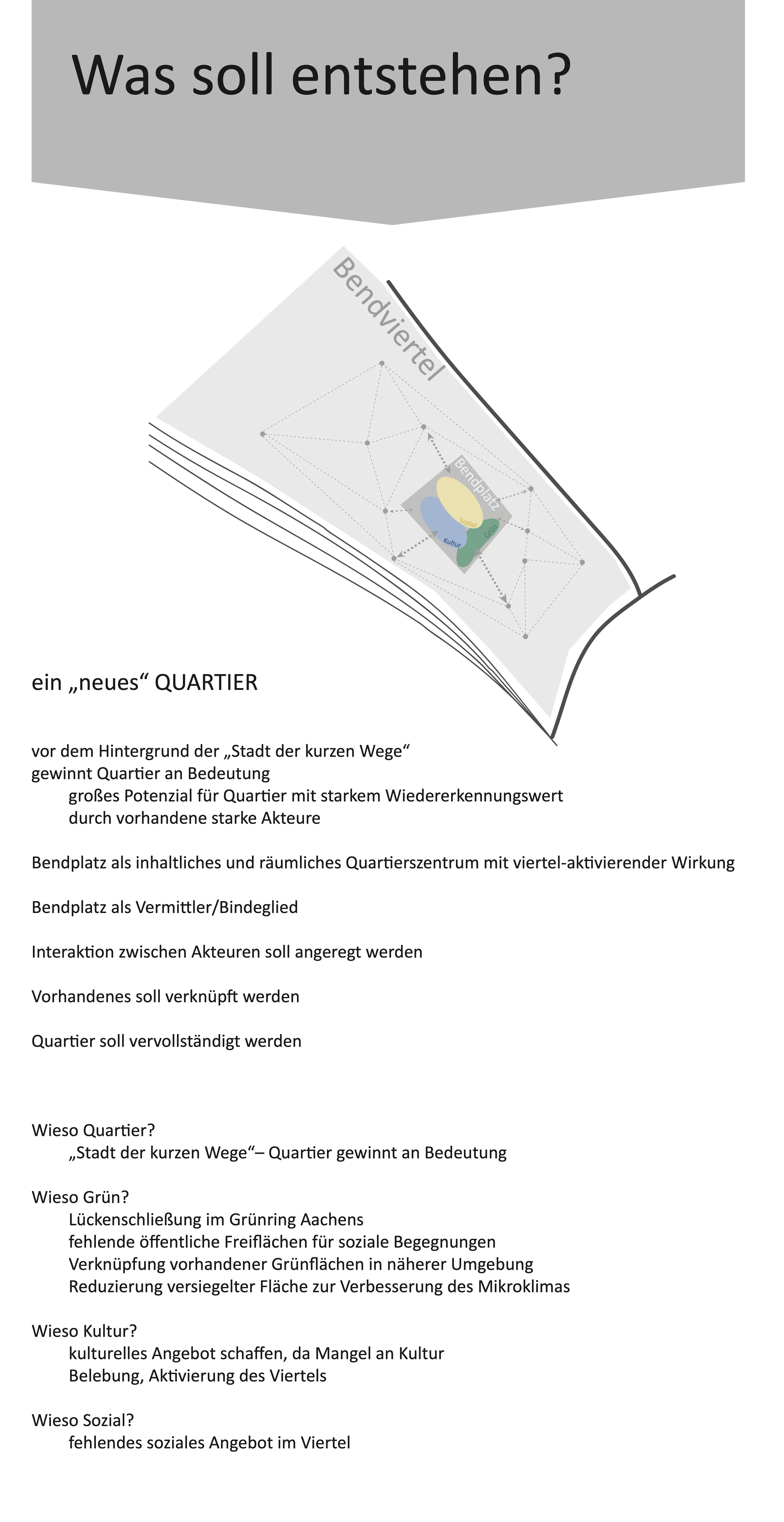 Nach einer umfassenden Bestandserfassung werden die zusammengetragenen Ergebnisse bewertet. In der SWOT-Analyse werden Schwächen und Stärken, sowie mögliche Gefahren und Chancen des Planungsgebietes gegenüber gestellt. Im gesamten Planungsgebiet fällt auf, dass am Bendplatz in nahezu allen Betrachtungspunkten viele Diversitäten aufeinander treffen. Beispiele hierfür sind die vielen unterschiedlichen Nutzergruppen, die verschiedene Erschließungsmöglichkeiten oder Bautypologien. Die Bewertung dieser Aspekte bietet sowohl Gefahren als auch Chancen. Diese Erkenntnisse bilden die Grundlage für das im Anschluss formulierte Rahmenkonzept des Entwurfs.