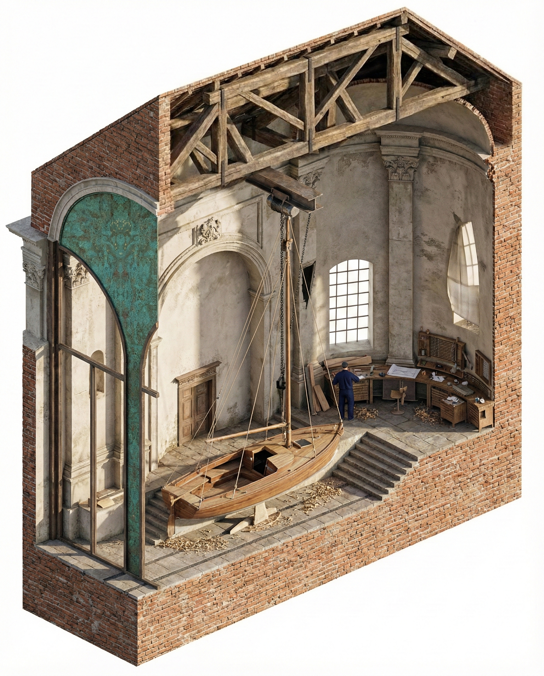 The boatyard within the repurposed San Nicolo Church is arranged to support all stages of boat construction, comprising three specialized workshops, an office space, and an assembly hall.