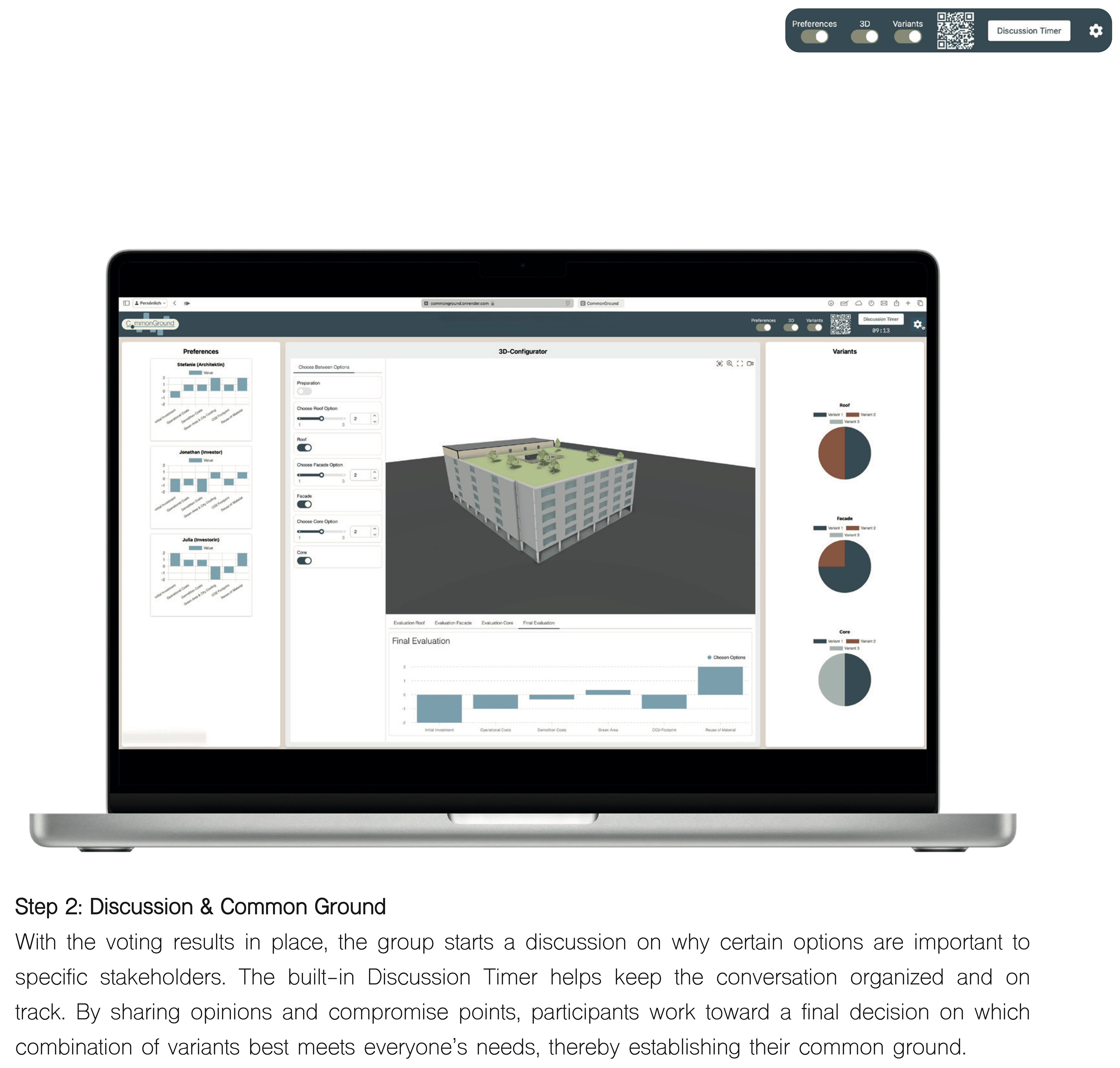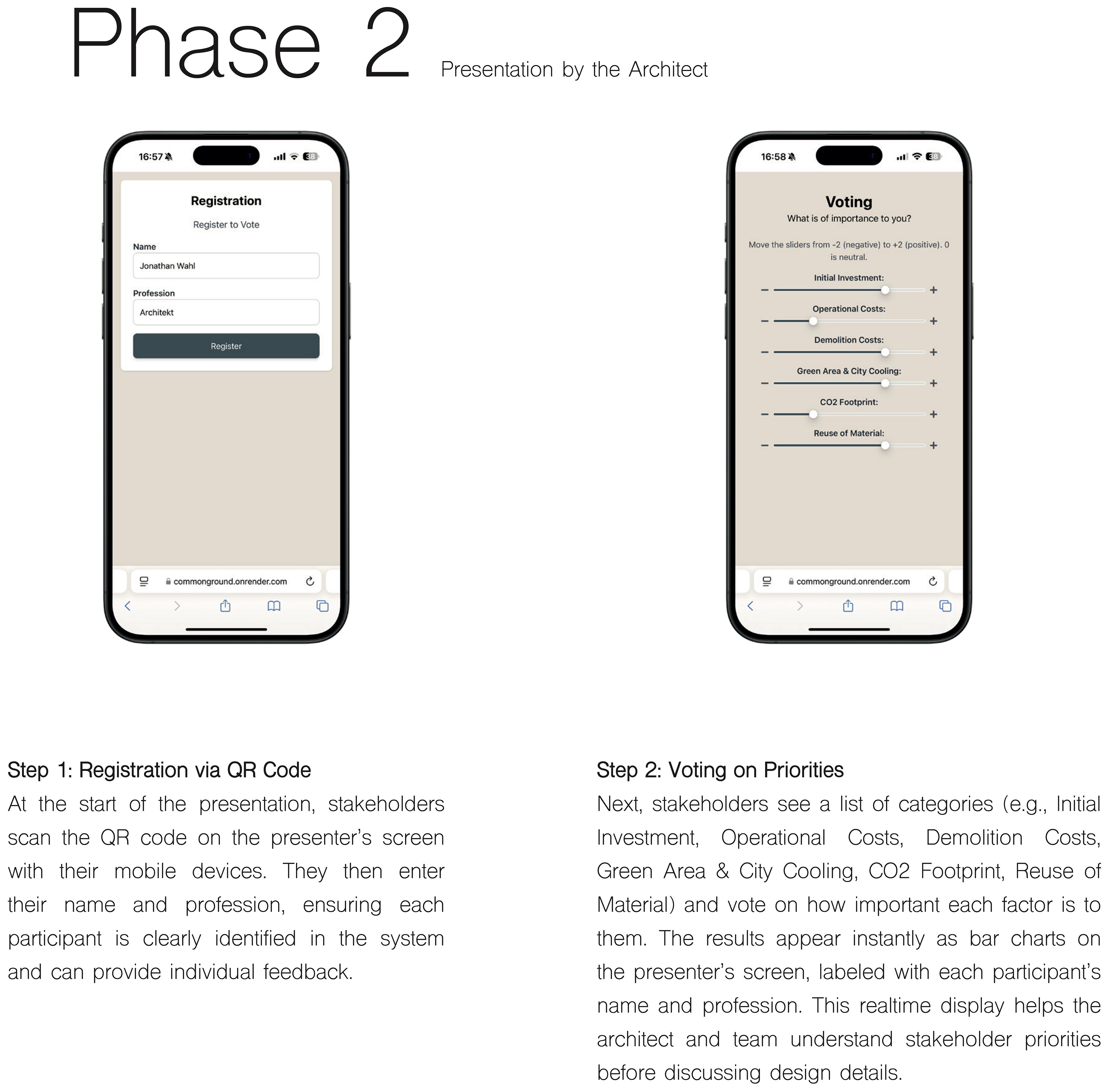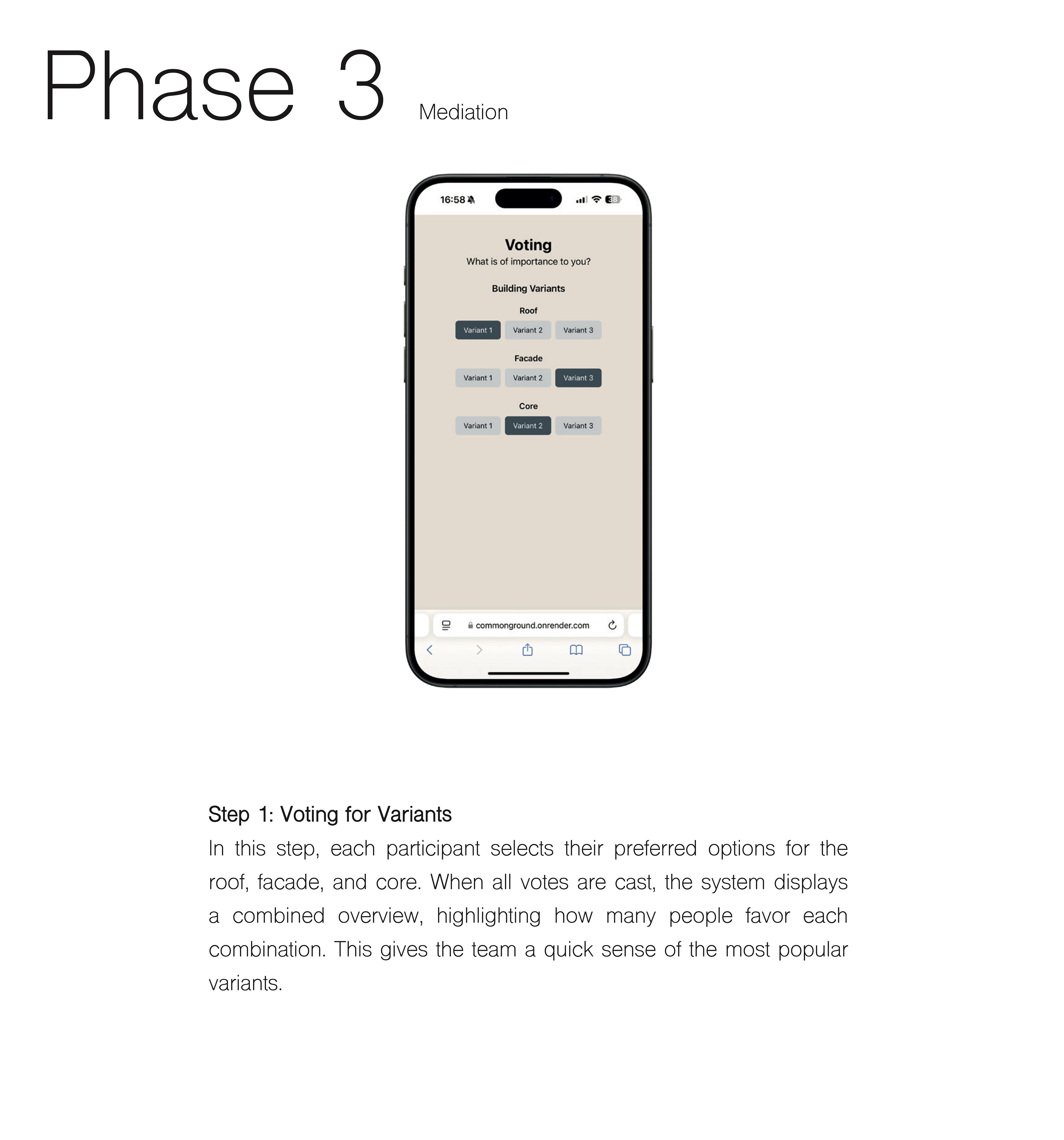 By combining clear data presentation, flexible mediation tools, and more realistic visualisation, Common Ground can evolve into a balanced platform that considers both the technical and human factors of architectural design.