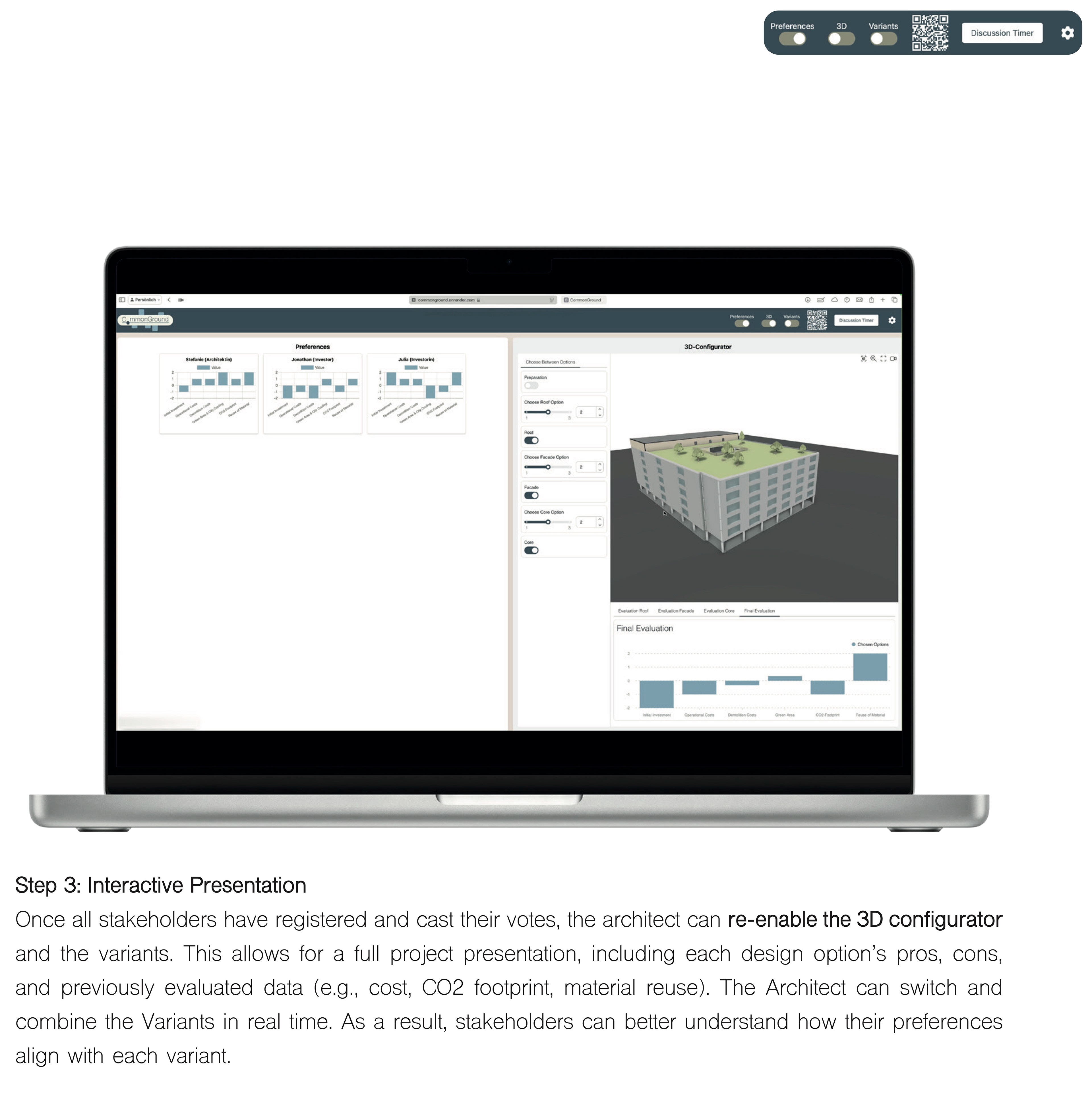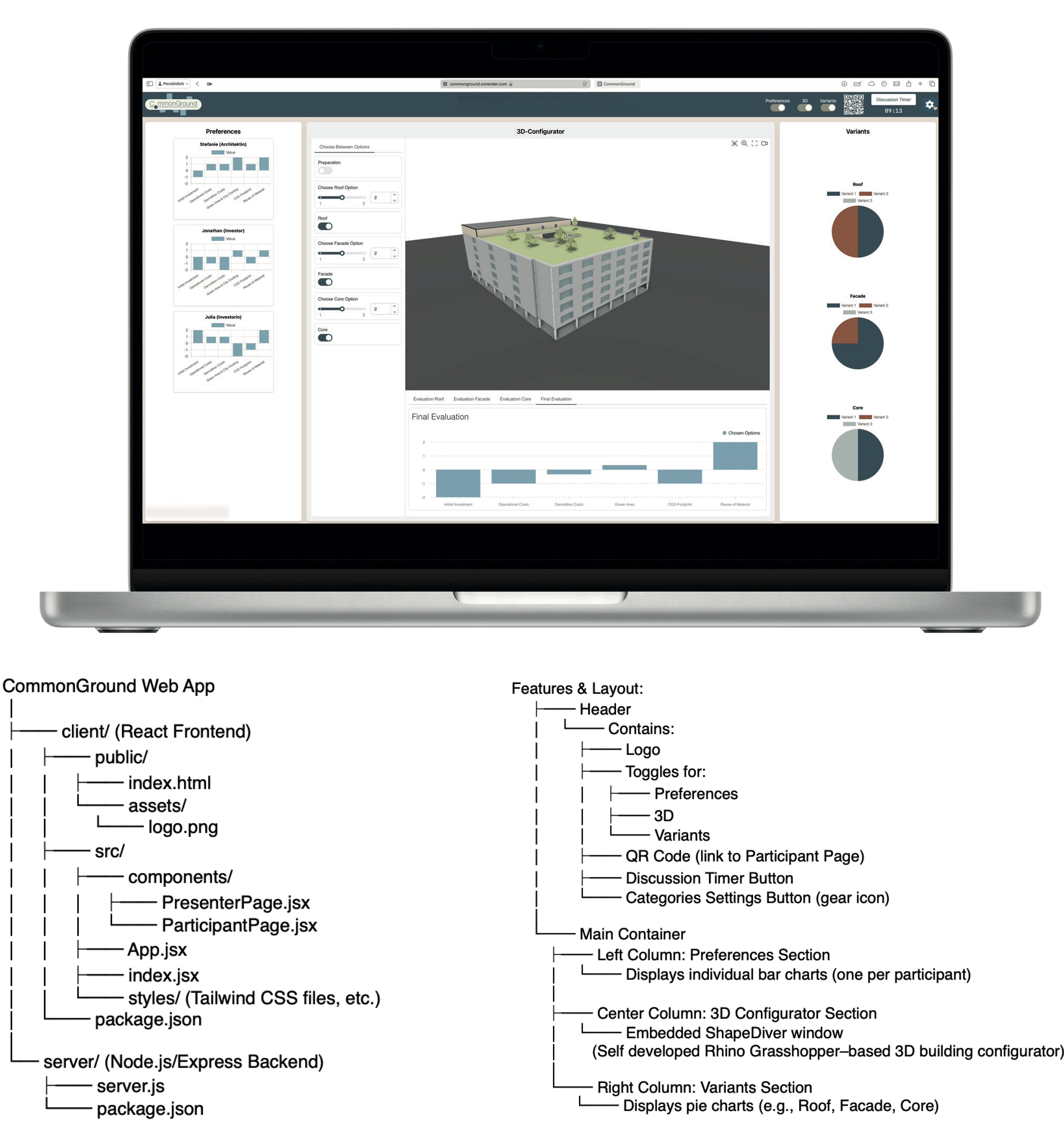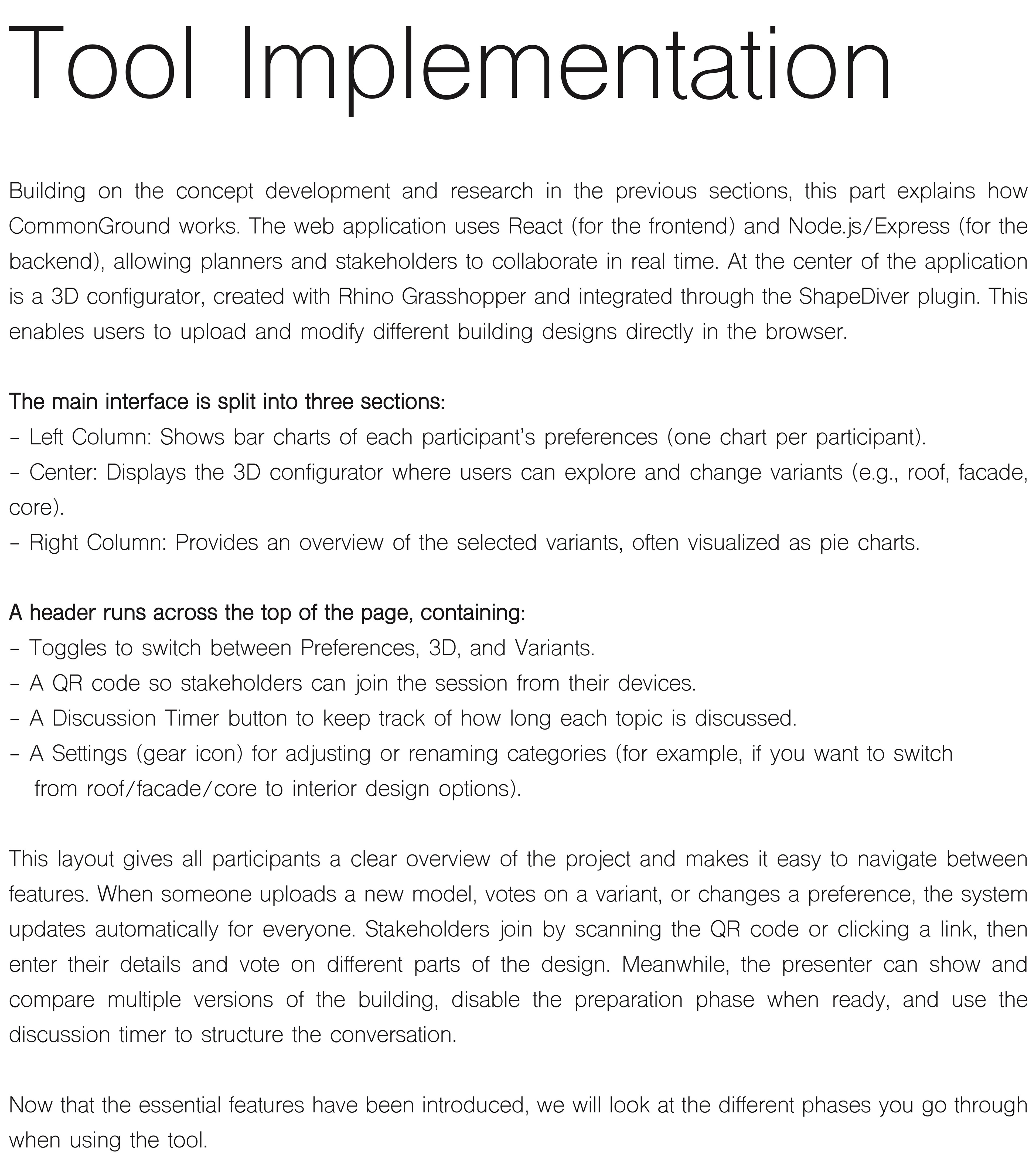 By combining clear data presentation, flexible mediation tools, and more realistic visualisation, Common Ground can evolve into a balanced platform that considers both the technical and human factors of architectural design.