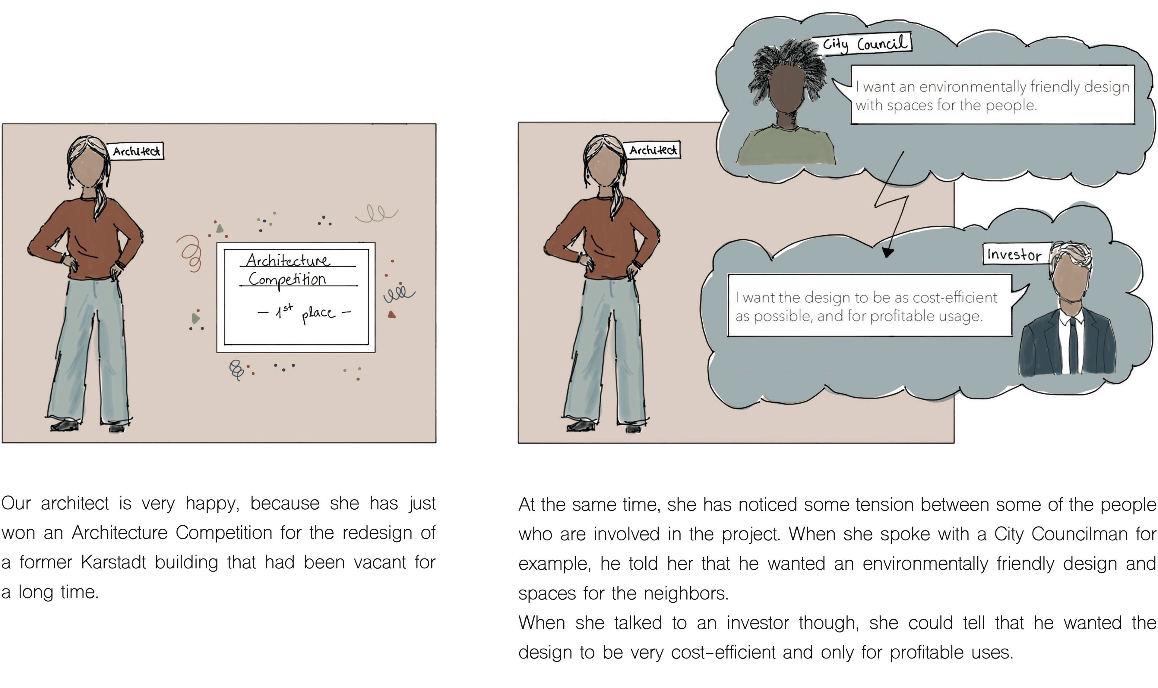 After the presentation by Oliv Architects, we realized how valuable the tool could be in the sense of mediating between all the stakeholders, since they oftentimes have very different imaginations about important projects like the future of a department store. Thus, we developed the idea for an Interactive Mediation Tool for Collaborative Architectural Planning. Eventually, we stumbled upon the problem that it was very hard to determine, which parts of the building should be interchangeable, and how to include this into a tool.